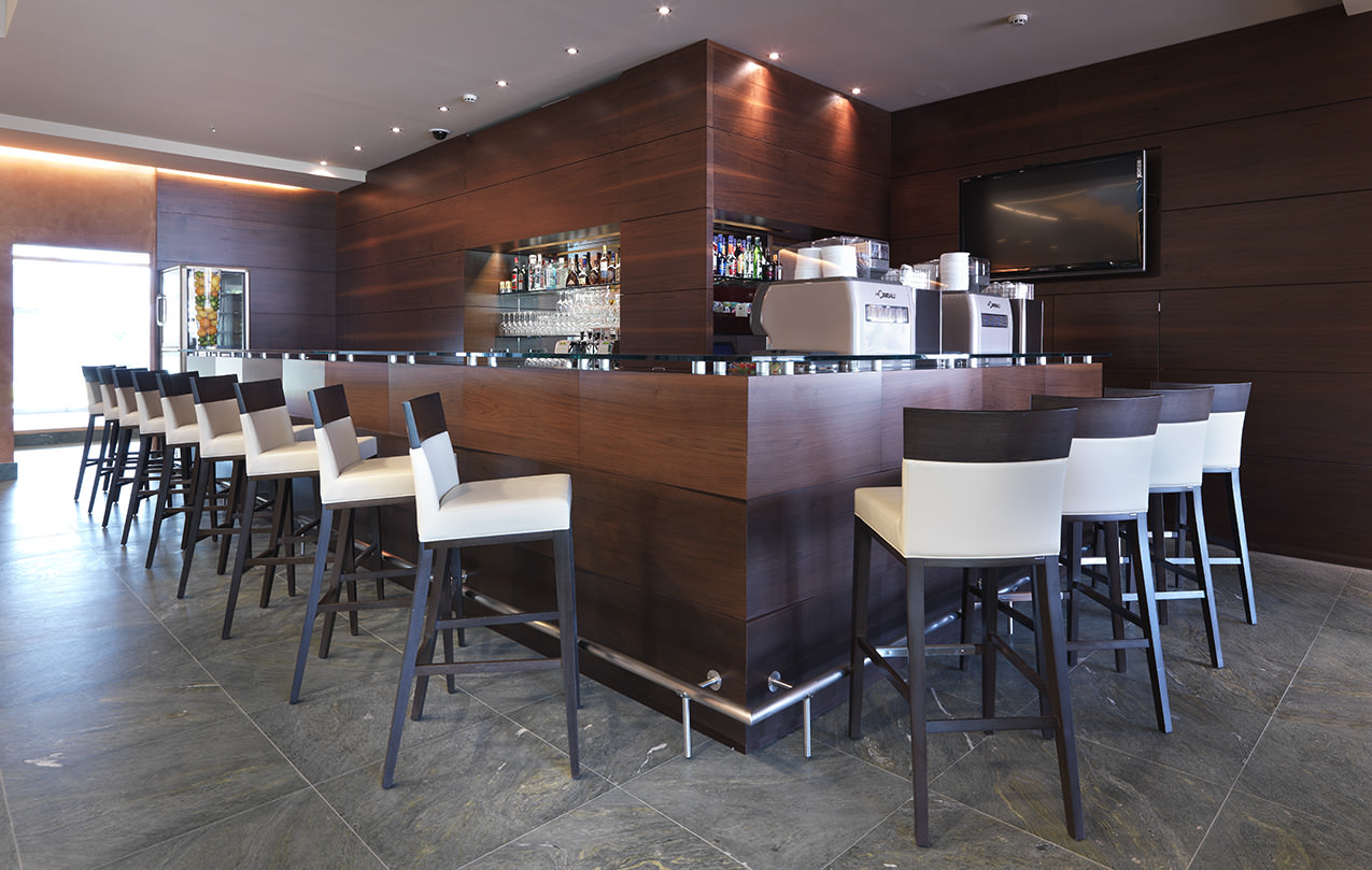 Peldoro a également créé le design de la réception et du comptoir du bar lounge, fournissant également des meubles tels que des canapés, des tabourets et des étagères. L’escalier en bois et verre visible sur les photos a été construit sur mesure dans notre atelier avec des matériaux haut de gamme et a ensuite été monté dans le hall.